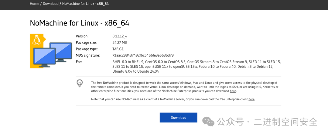 NoMachine目前支持Windows、Linux、MacOS甚至Android系统, 下面演示一下在ubuntu系统上的服务端安装方法。ubuntu系统的服务端安装包直接移步: https://downloads.nomachine.com/download/?id=1 , 直接点击Download按钮下载TAR.GZ格式的安装包,如图: