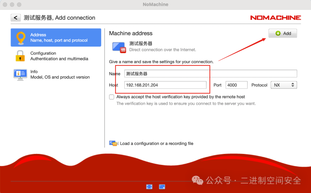 点击Add按钮进入添加新连接界面,选中左边Address项,在对应的右边栏中填入信息,其中Name输入一个连接名称、Host中填入远程服务器IP地址,完成之后点击右上角Add按钮完成新连接添加,如图: