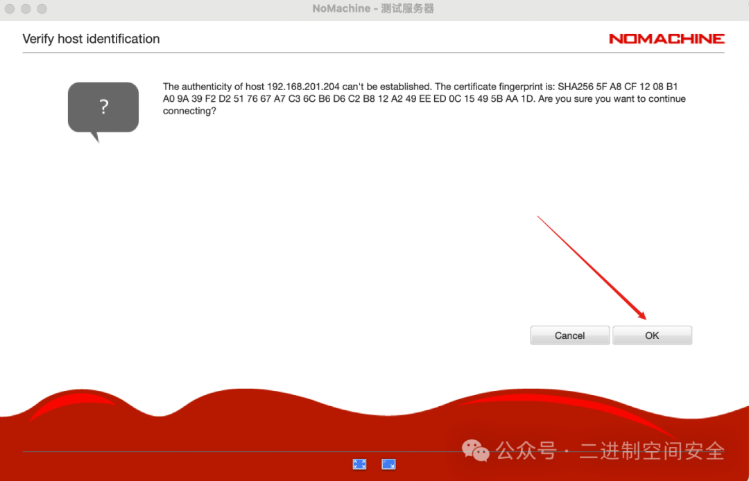 选中测试服务器,点击上面第三个按钮Connect,将开始尝试连接远程桌面,中途可能会弹出密钥验证询问界面,直接点击OK按钮,如图: