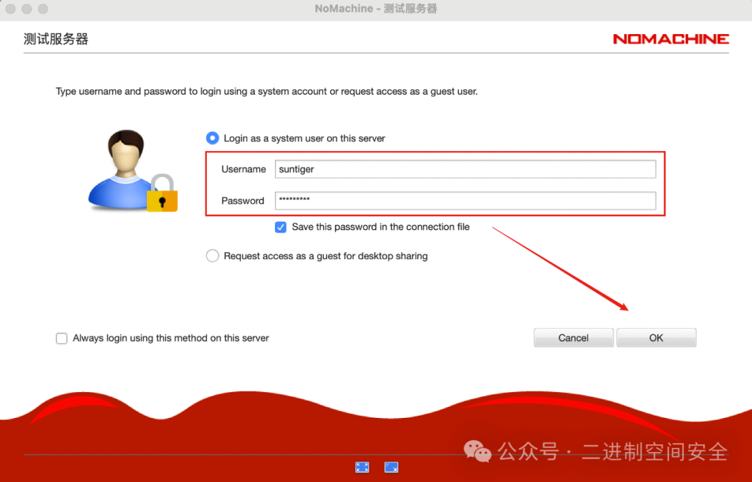 之后,会出现要求输入服务器登录用户名,密码的界面,输入后点击OK按钮,如图: