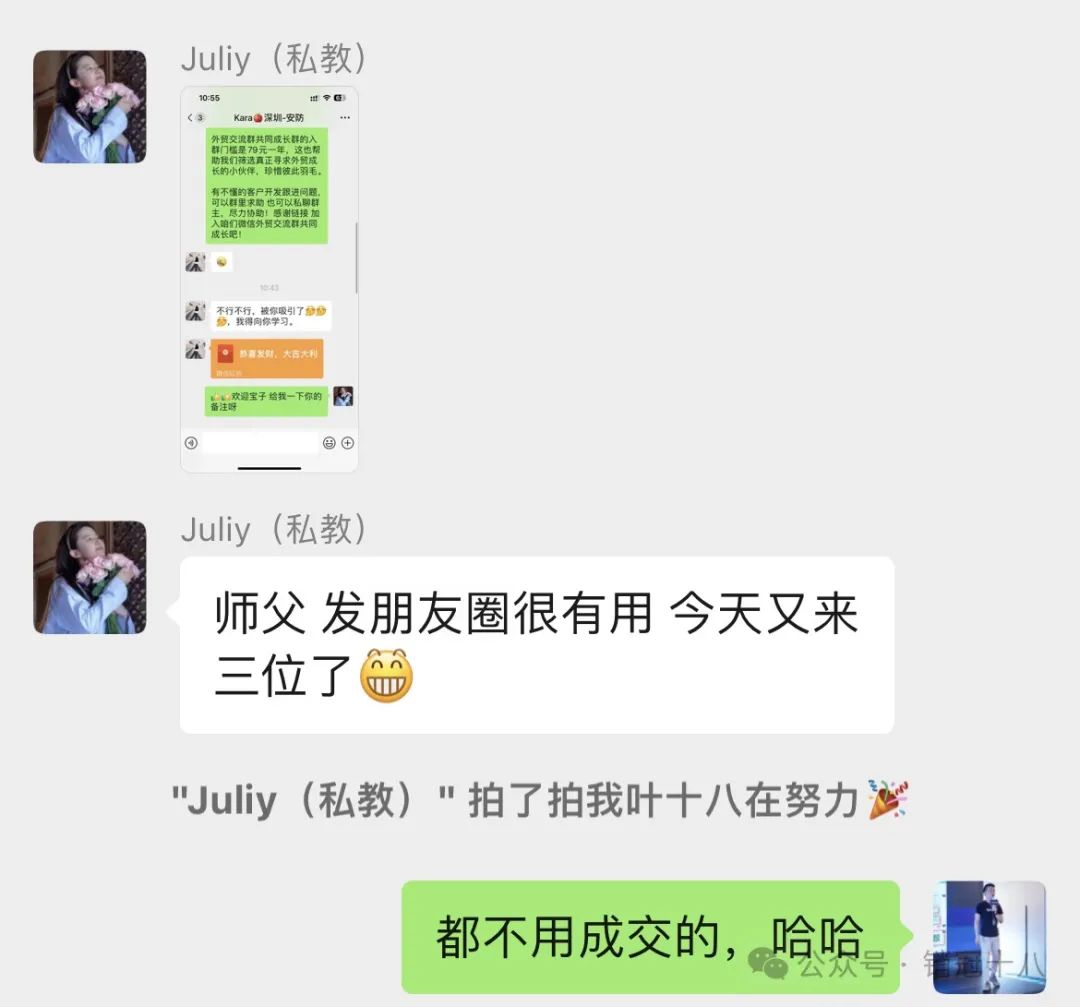 你只有开始做了,拿到一小点反馈的时候,你会发现,发朋友圈简简直就是咔咔收钱。