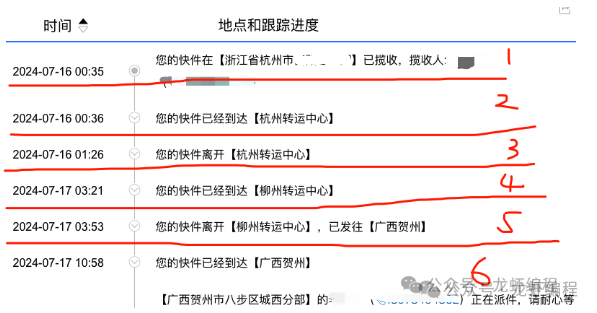 随着公司的业务发展不断的壮大,像一些核心的业务(如订单)数据量会越来越大,此时就需要考虑分库分表方案来应对业务的发展。今天就来聊聊分库分表的一些设计方案。 1、冷热数据分离方案 在我们业务中有些数据只是最近一段时间使用比较频繁,过着这段时间就基本上不用了,如龙虾之前负责的物流系统中的物流轨迹数据,一条物流单号对应着若干条物流轨迹数据,如下所示的物流轨迹: