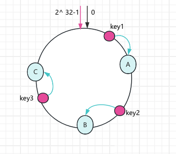 查表映射法可以灵活设置路由规则,但是要求映射表本身的数据不能太多,否则映射表反而成为性能瓶颈了。 查表映射法相对其他两种分片算法来说,它需要二次查询、实现上也更加的复杂一些。 (4)一致性hash 一致性hash可以按照普通的hash算法对key哈希到一个圆环空间上,形成一个顺时针的首位闭合的环形,如下图所示: