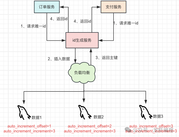 通过增加多台数据库服务并且给每个数据库都设置起始值,然后通过设置步长来让数据生成的ID趋势递增且不重复。
