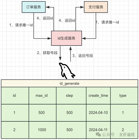 此方案适用于数据量不大,数据库不需要扩容的场景。 4、数据库号段模式 此方案实质就是批量从数据库获取自增的id,即就是每次从数据库取出一个号段范围,如(1-3000]表示从数据库中生成3000个自增id。数据表的设计如下: