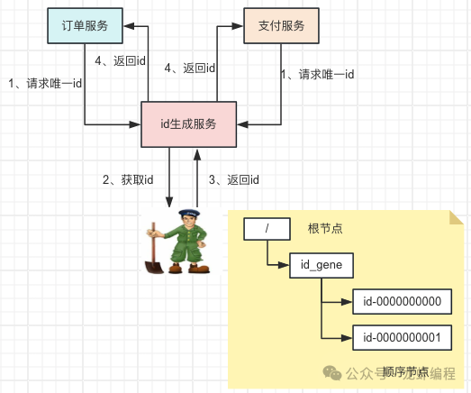 6、Zookeeper实现分布式id Zookeeper客户端创建顺序节点时会根据创建的时间顺序,在节点名称后添加 10 位的顺序编号,利用Zookeeper的这个特性实现id的唯一性。