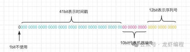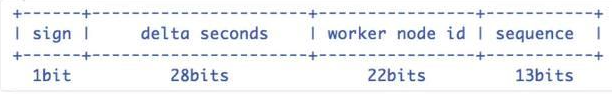 由于依赖Zookeeper并且存在多步的异步调用,如果竞争较大的的情况下还需要考虑使用分布式锁,因为很少会使用Zookeeper来生成唯一id。 7、雪花算法 雪花算法是使用一个64bit的long类型数字作为全局唯一id,下图是展示了雪花算法生成唯一id时候各个bit位的作用:
