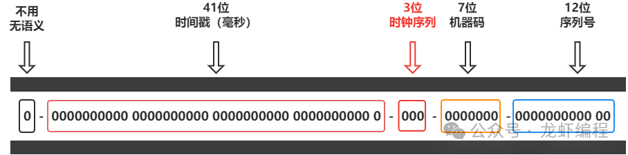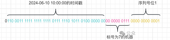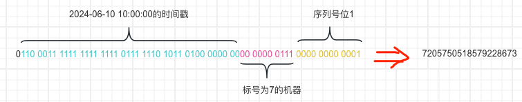 假设当前时间是2024-06-10 10:00:00,生成id的机器编号是7,序列号为1,据此雪花算法生成的id如下所示: