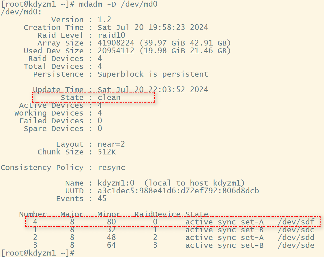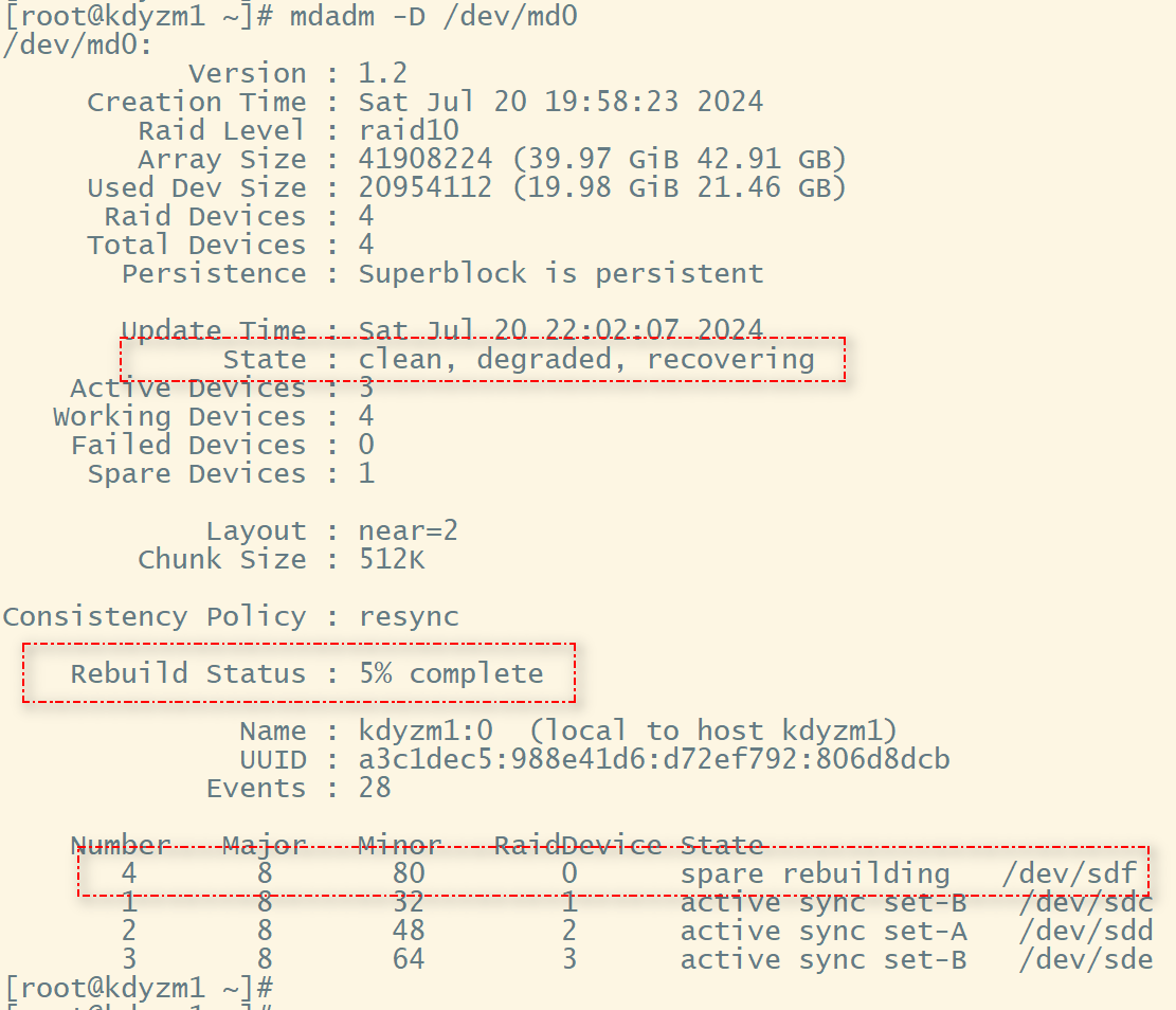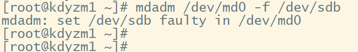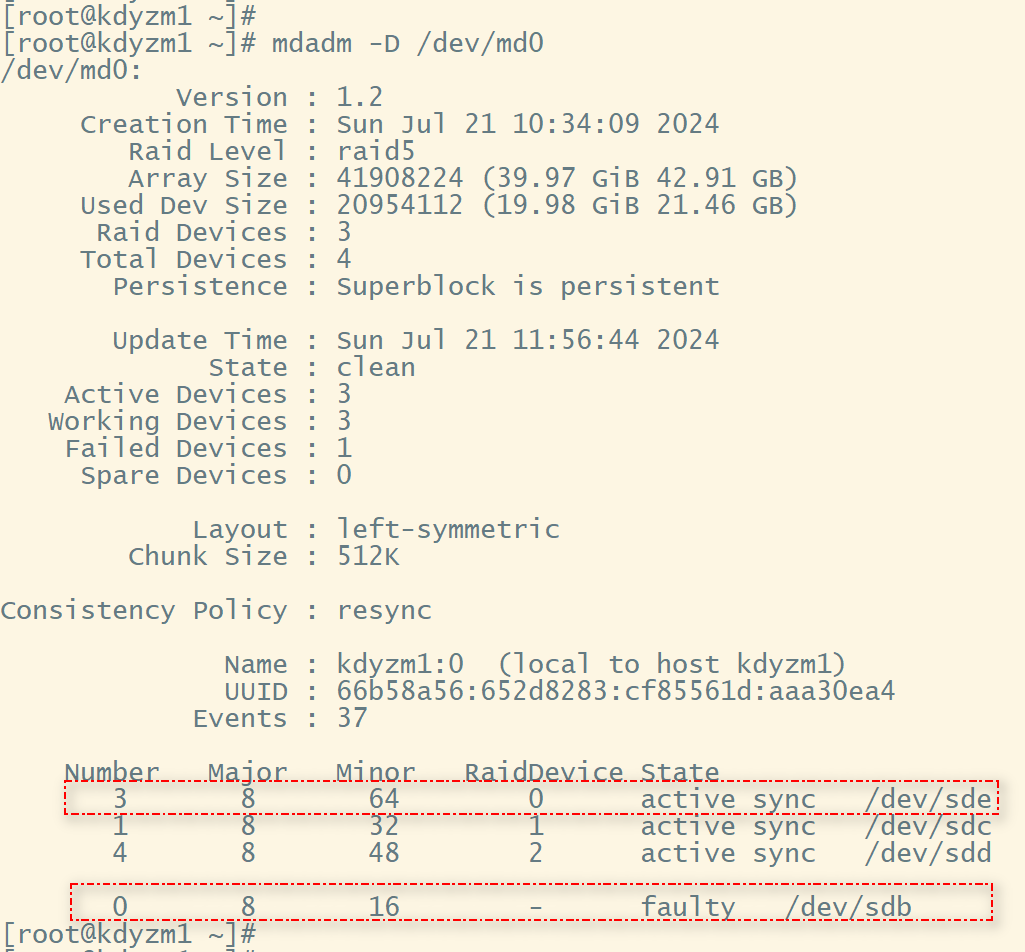 然后我们将一块硬盘/dev/sdb标记为已损坏,看看效果如何