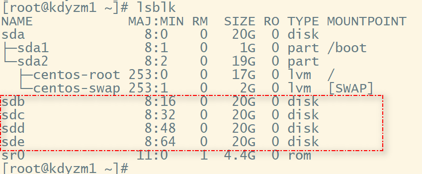 接下来用RAID5为例演示该功能。RAID5要求最少要3块硬盘,所以我准备了3块硬盘+1块备份盘一共四块硬盘。下图中的sdb、sdc、sdd、sde一共四块。