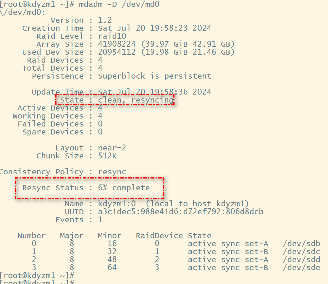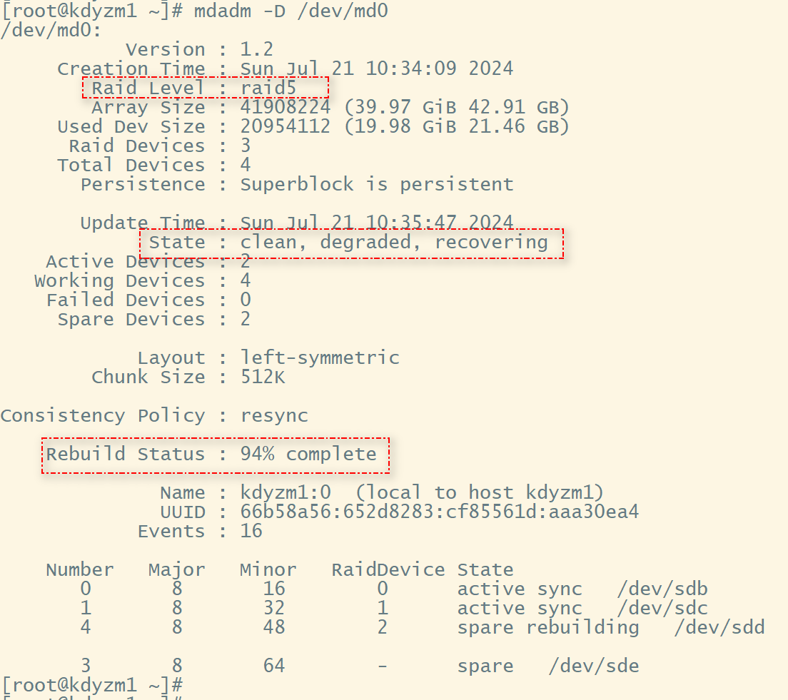 接下来,马上运行命令mdadm -D /dev/md0 查看当前磁盘阵列的详情