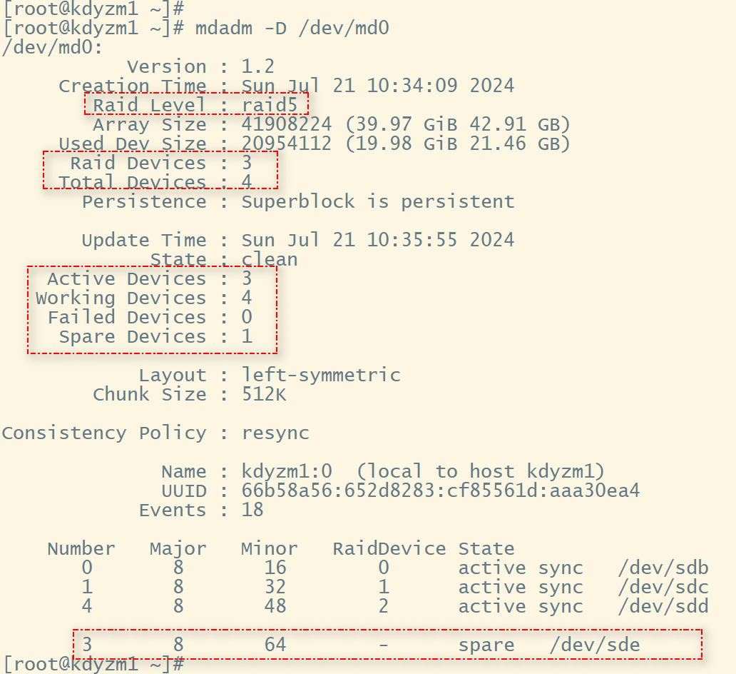 可以看到该RAID5磁盘阵列中有4个硬盘,但是只有3个是RAID的组成部分,还有一个Spare Device,也就是备份盘。