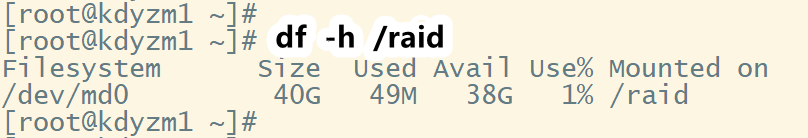 可以看到3块20G的硬盘组成的RAID5,挂载到/raid目录后,可用存储大小为40G,符合预期。