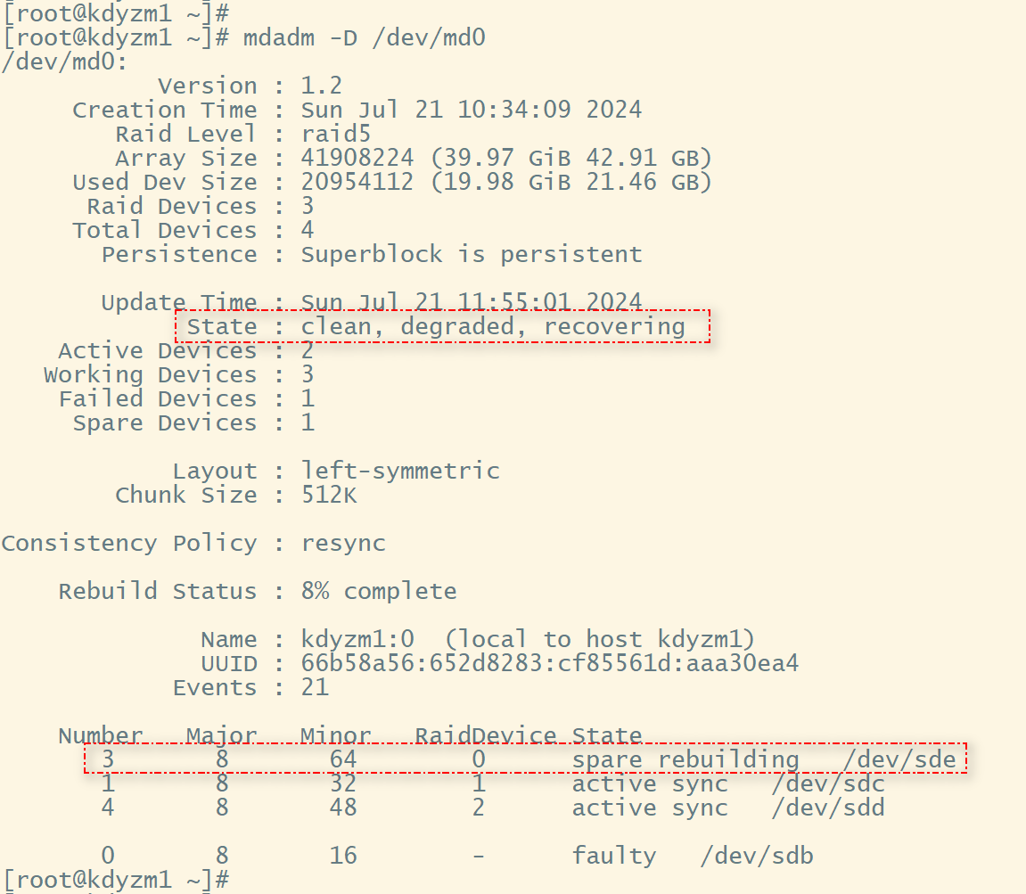 可以看到/dev/sde已经完全取代了坏掉的/dev/sdb硬盘,并已经在正常工作。