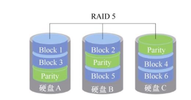 在上图中,Parity就是校验和块,每个磁盘都有其余所有磁盘对应块计算之后的校验和,这样就不怕任何一块磁盘坏掉了,如果有一块硬盘坏掉,只需要把所有其它盘对应块的数据做一次校验和,就知道缺失的这块的数据是什么了。这也就解释了为什么RAID5最少需要3块硬盘,而且3块硬盘的容量要一样。