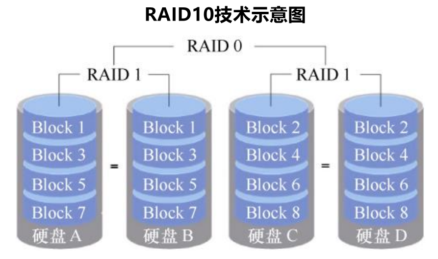 首先,得说明,RAID10的叫法是“RAID一零",而非”RAID十“,RAID 10 技术是 RAID 1+RAID 0 技术的一个“组合体”。如下图所示