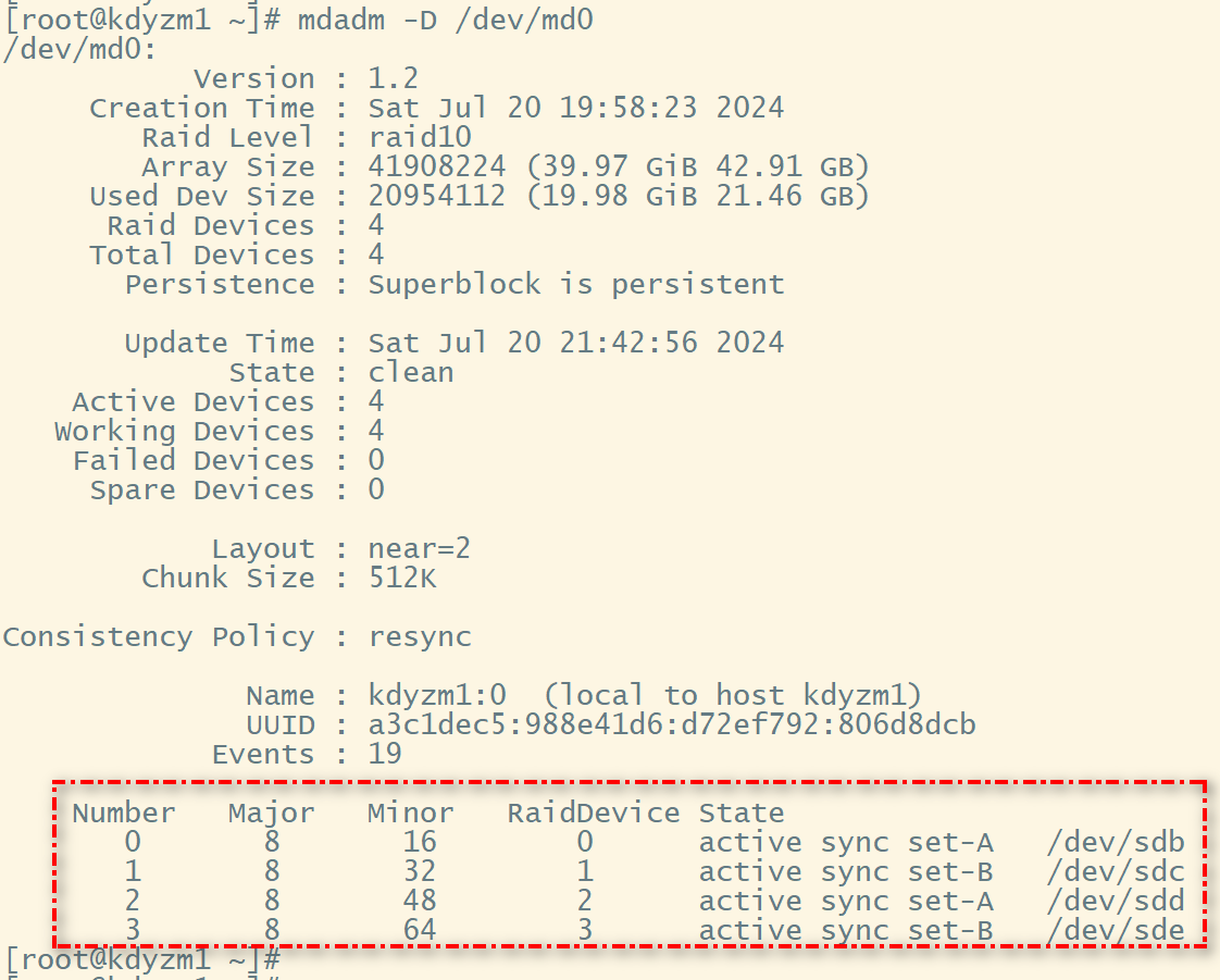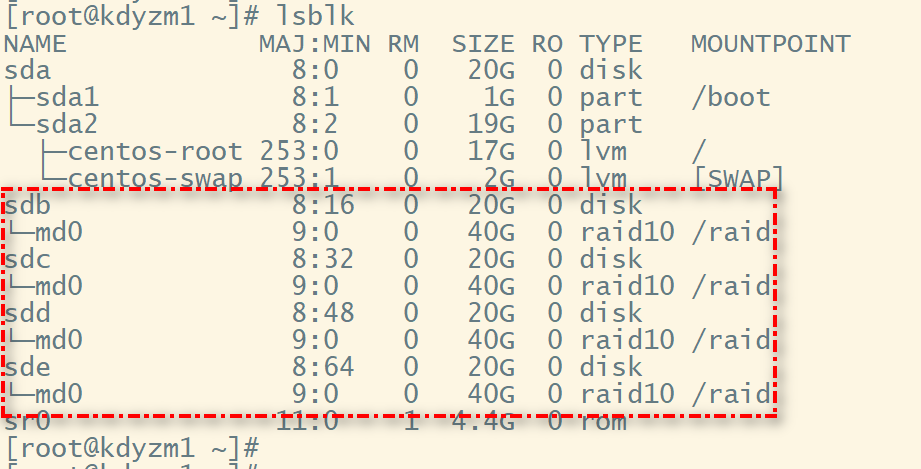 磁盘阵列中的四个磁盘下都有md0分区,而且都是都是raid10类型。