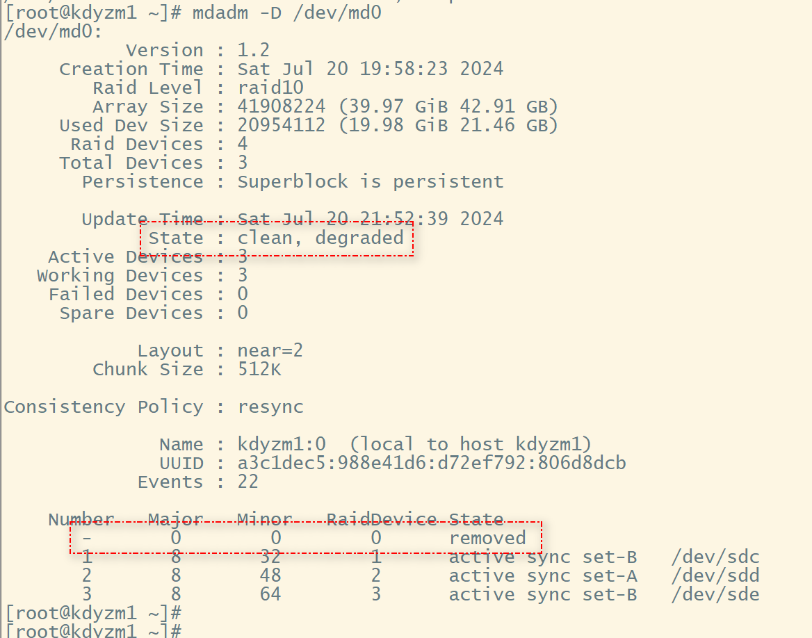 可以看到磁盘阵列状态多了个"degraded",表示磁盘阵列降级了,这意味着 RAID 阵列中至少有一个磁盘故障或处于离线状态,导致阵列无法以完全冗余的方式运行。因为我们移除了/dev/sdb硬盘,所以提示degraded状态是正常的。