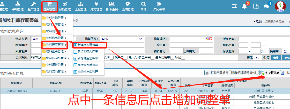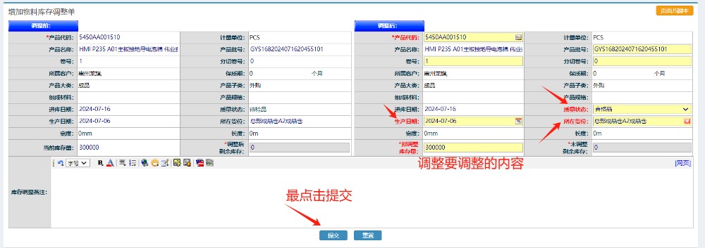 ![]() ![]() 操作步骤: 1.进入新增状态状态调整单,点中要调整的物料信息后,点击增加调整单。 如下图: 2.把质量状态调整成合格品 如下图: ![]() 3.最后点提交,提交完后到库存查询界面重新打出标签贴上。 如下图: