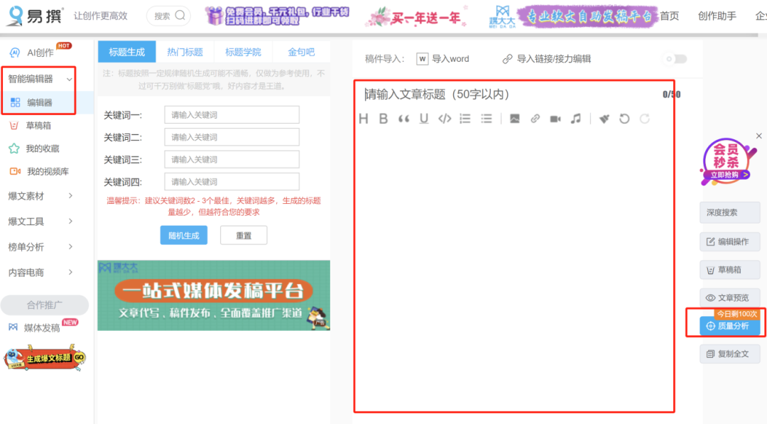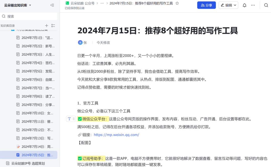 俗话说:工欲善其事,必先利其器。 下面和大家分享8款常用提高写作效率的工具,从热点、排版到配图,通通都囊括其中。 1、官方工具 做公众号,必备以下这三个工具 ✅微信公众平台:这是公众号网页版的操作界面,发布内容,粉丝互动、广告开通、后台设置等都在此。 满500粉之后,记得在后台开通各项权益,并添加收款账号,方便腾讯给你打款。 ✅订阅号助手:这是一款APP,电脑不方便携带时,它就很好地解决了数据查看、留言互动等问题,写好的内容也可以保存在草稿箱里,随时随地都能直接一键发表。 ✅微信广告助手:这是一款小程序,每天早上都会推送“流量主数据日报”,醒来就能看到前一天的收益。 2、热点工具 即使热榜:涵盖全网的一手热点资讯。 登录网站首页,就能看到各大平台最新的热点,点击对应的标题,直接跳转到原链接,方便快速搜集对应的热榜内容。 对于追热点的小伙伴来说,这个网站就是作弊神器,登录一个平台,就能网络各大平台的热点。 3、写作工具 一般情况下,我是在其他软件撰写好文章,排版后再同步到微信公众平台。 一方面是微信公众号后台不方便编辑,另一方面我要保存所有的底稿,在后台直接写,我还要复制出来,比较麻烦。 试过很多款软件,我目前还在用的只有飞书和石墨。这两款软件电脑和手机端都能使用,还能同步。 即使处于离线状态,也不用担心内容丢失,系统会系统保存。 飞书也是我目前在用的知识管理库工具。 4、金句 金句是文章的点睛之笔,必不可少。 如果自己想不出来,可以适当引用名人金句。我从三年前写稿,就一直在使用句子控和深言达意(原来叫据意查句)。 ✅句子控:手机APP,每天都会推送优美句子,可以通过关键词,搜索到你想要的句子。 ✅深言达意:在电脑端使用,可以找词、找句、找素材,海量内容可以让你妙笔生花。 如果你不想直接用名人的句子,也可以借鉴人家的结构,创作出属于自己的金句。 🔗链接:https://www.shenyandayi.com/ 5、原创检测 今日头条和公众号对文章原创度有一定要求,如果你想给文章打上原创,建议写好之后检索一下。 我一直在用易撰,登录网页版界面,有两个地方都可以检索,分别是:智能编辑器-编辑器-质量分析,以及爆文工具-文章质量检测-开始检索。 我对自己的要求是,文章原创度必须超过70%,如果不达标,那就个根据提示进行修改,知道符合要求。 这个平台每天只有3次免费检索机会,我自己开通了会员,不过建议大家别急着开,可以先借用家里人的账号登录。 另外,易撰也可以查看各大平台的热点文章,但也要会员。 6、配图工具 图文并茂的文章,能够提升读者的阅读体验,所以文章中少不了配图。 我的图片大部分都是自己拍的,如果要找网图,就要注意找无版权,避免侵权被投诉 之前看过新闻,有博主用了别人的图片,结果被作者起诉,赔了几百块。 虽然钱不多,但是能避免尽量避免,不然也挺影响心情的。 推荐免费的图片网站pixabay和手机端APP堆糖。 7、修图工具 自己拍的图片光线一般比较差,所以我会先修图再使用。 身边的博主都在用美图秀秀和黄油相机,而我自己偏好用美图秀秀。 这款软件中有大量的模板和滤镜,也可以自己调试。 8、排版工具 微信公众平台自带的排版,我个人觉得不好用,也可能是我用不习惯。 所以我都是直接用135编辑器,里面有海量的模版,你可以一键使用,也可以选择喜欢的样式,做出自己喜欢的排版。 在电脑端调整好格后,点击保存同步,就可以一键同步到微信公众平台。 🔗链接:https://www.135editor.com/