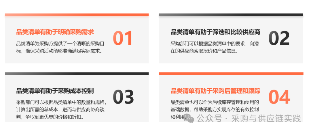 采购品类清单是采购活动中最重要的输入项之一,品类清单在集中采购过程中扮演着至关重要的角色。它不仅是采购活动的基础,也是确保采购过程高效、准确和有序进行的关键工具。 一、采购品类清单的定义。 采购品类清单通常是一份详细的文档或列表,用于记录企业在采购活动中所需的各种物品或服务的分类和具体项目。它是一份系统化的文件,其中包含了各类采购品项及其具体规格、数量、质量要求、意向供应商等信息,按照不同的商品类别或服务类型进行划分和组织。 二、采购品类清单的主要分类。 在实际操作中,采购品类清单可能包括但不限于以下内容: ![]() 1、通用品类。如日常办公用品、食品原材料、消耗品、电子设备、家具、劳保用品、宣传材料等。 2、专用品类。如特定行业的机械设备、零部件、专用工具、科研试剂、定制软件等。 3、服务品类。如外包服务、专业咨询服务、维修保养服务、租赁服务、物流服务等。 4、工程品类。如装修工程,电气工程,给排水工程,暖通工程,消防工程, 智能化工程,绿化工程,节能环保工程,机械安装工程等。 5、环境标志产品品类。在绿色采购中,还会列出符合环保标准的产品,例如节能电器、节水器具、环保建材等。 三、采购品类清单的作用。 ![]() 1、品类清单有助于明确采购需求。 在集中采购开始之前,需求部门需要详细列出所需物品或服务的品类,包括名称、规格、数量等。这份品类清单为采购方提供了一个清晰的采购目标,确保采购活动能够准确满足实际需求。 2、品类清单有助于筛选和比较供应商。 采购部门可以根据品类清单中的要求,向潜在的供应商索取报价和产品信息。通过对比不同供应商的报价、产品质量、售后服务等,采购方可以选择最合适的供应商,确保采购活动的质量和效益。 3、品类清单有助于采购成本控制。 在集中采购过程中,采购部门可以根据品类清单中的数量和规格,计算出所需的总成本。通过与供应商协商谈判,采购方可以争取到更优惠的价格和折扣,从而降低采购成本。 4、品类清单有助于采购后管理和跟踪。 采购完成后,采购方可以根据品类清单对采购的物品或服务进行验收和入库。同时,品类清单也可以作为后续库存管理和使用的基础数据,帮助采购方实现库存的有效控制和利用。 总之,采购品类清单有助于采购部门进行有效的需求分析、预算控制、供应商选择、价格谈判以及合同管理,确保采购活动有序进行,满足组织运营或项目实施的需求。 因此,品类清单在集中采购中发挥着重要作用。它不仅是采购活动的基础,也是确保采购过程高效、有序进行的关键工具。在进行集中采购时,应充分重视品类清单的编制和使用,以确保采购活动的顺利进行和取得良好效果。 该文章在 2024/7/30 18:36:36 编辑过 |