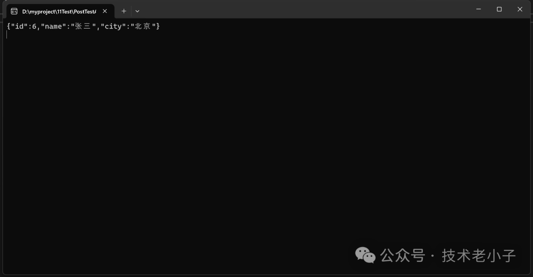 RestClient client = new RestClient();User user = new User();user.name = "张三";user.city = "北京";string jsonData = System.Text.Json.JsonSerializer.Serialize(user);string ret = await client.PostDataAsync("https://localhost:7144/api/User/Add",jsonData);Console.WriteLine(ret);