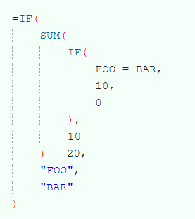 =IF(SUM( IF(FOO = BAR, 10, 0), 10 ) = 20 , "FOO", "BAR")