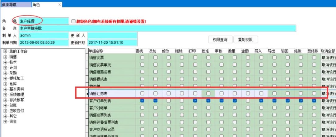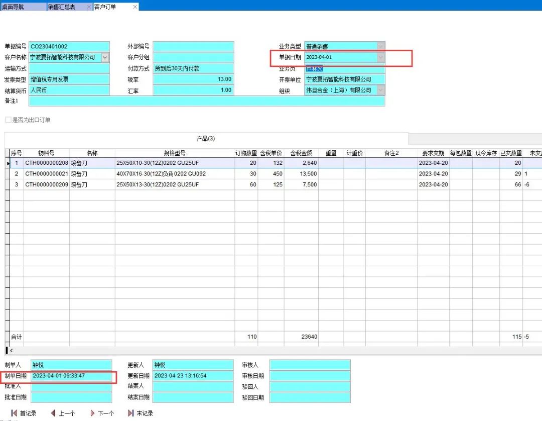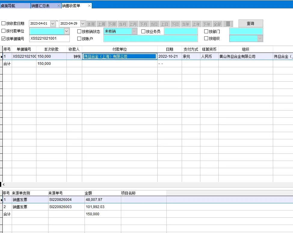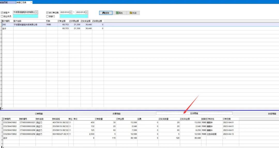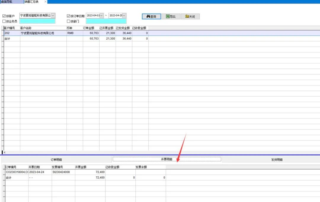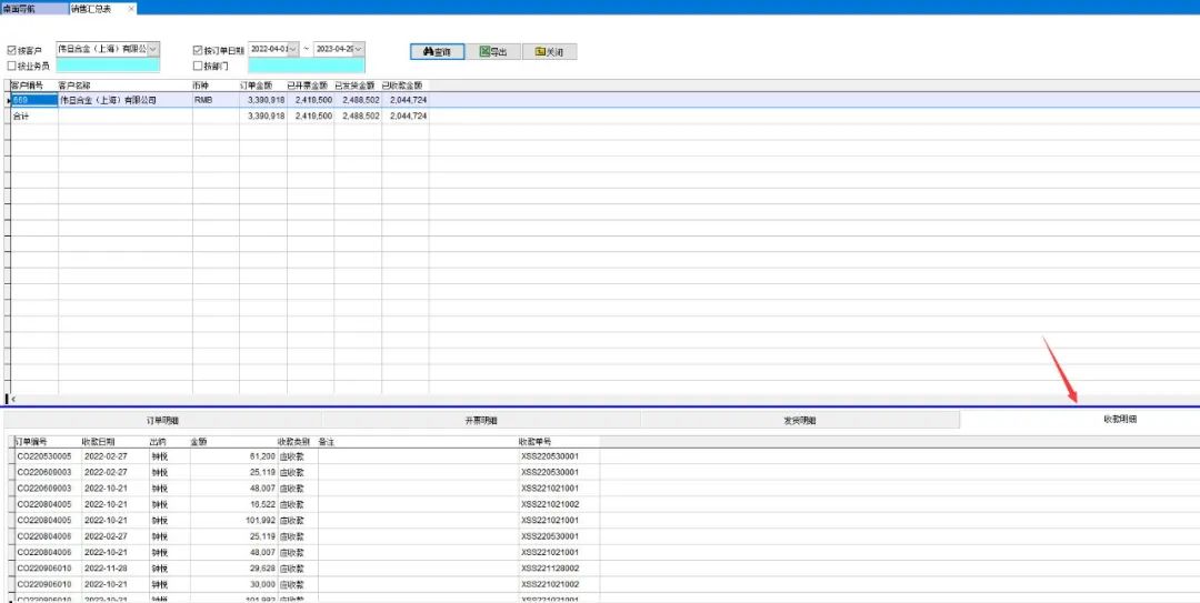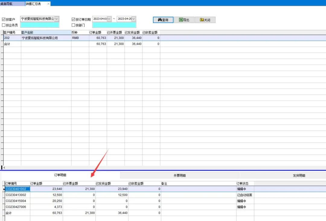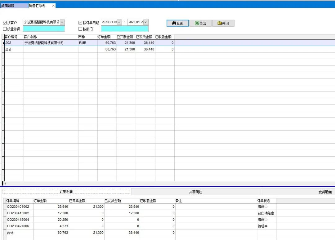 打开路径:【主菜单】->【销售】-> 【报表】->【销售汇总表】 销售汇总表是综合反映一段时间内销售订单的执行情况,包括订单情况、开票情况、已发货情况、已收款情况。 销售汇总表上半部分是某客户总的订单金额、已开票金额、已发货金额、已收款金额,金额都是含税金额。每个客户一行记录。下半部分是显示该客户所有销售订单、销售发票、销售发货单、销售收款单 按订单日期查询 销售汇总表上的按订单日期查询的订单日期是指客户订单的单据日期,客户订单上有两个重要的日期,单据日期和制单日期。默认情况下单据日期就是制单日期,但是单据日期是可以手工修改的,比如今日是2号,补做一张昨天的客户订单,那么单据日期就是1号,而制单日期就是2号。单据日期是客户订单实际发生的日期,制单日期是在ERP系统中录入客户订单时的日期。 订单明细 显示该客户这段时间内的所有订单执行情况,一个订单一行记录,包括订单金额、开票金额、发货金额、收款金额 发票明细 发货明细 收款明细 双击显示单据 在单据编号上双击可以打开该单据,比如下图的销售收款单 导出 导出格式可以在导出布局中设置 权限 1、通过角色限制用户访问销售汇总表,如下图,张三是生产经理,他没有权限打开销售汇总表 2、业务员有权限查询销售汇总表,但是只能查看本自己客户的数据 客户资料表中指定该客户是哪个业务员的 业务员设置中指定该业务员只能查看本人客户数据 总结:销售汇总表是销售业务的汇总明细表,既能看到汇总订单金额、收款金额、发货金额、开票金额,也能看到订单明细、收款明细、发货明细、开票明细,适合企业管理者动态了解企业经营状况。 点晴模切ERP更多信息:http://moqie.clicksun.cn,联系电话:4001861886 该文章在 2024/7/29 17:59:29 编辑过 |