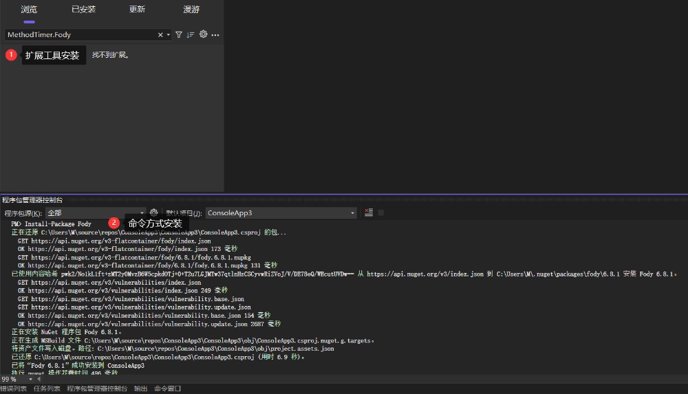 在Visual Studio中,打开NuGet包管理器,搜索并安装MethodTimer.Fody或者使用命令方式