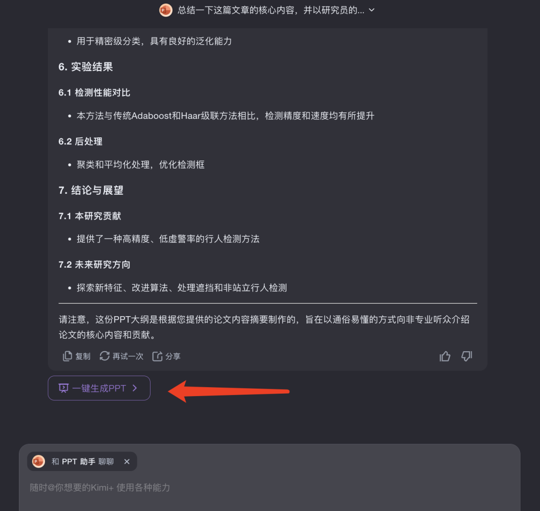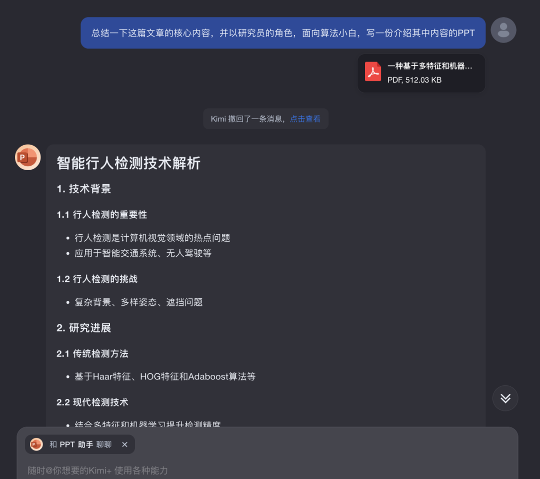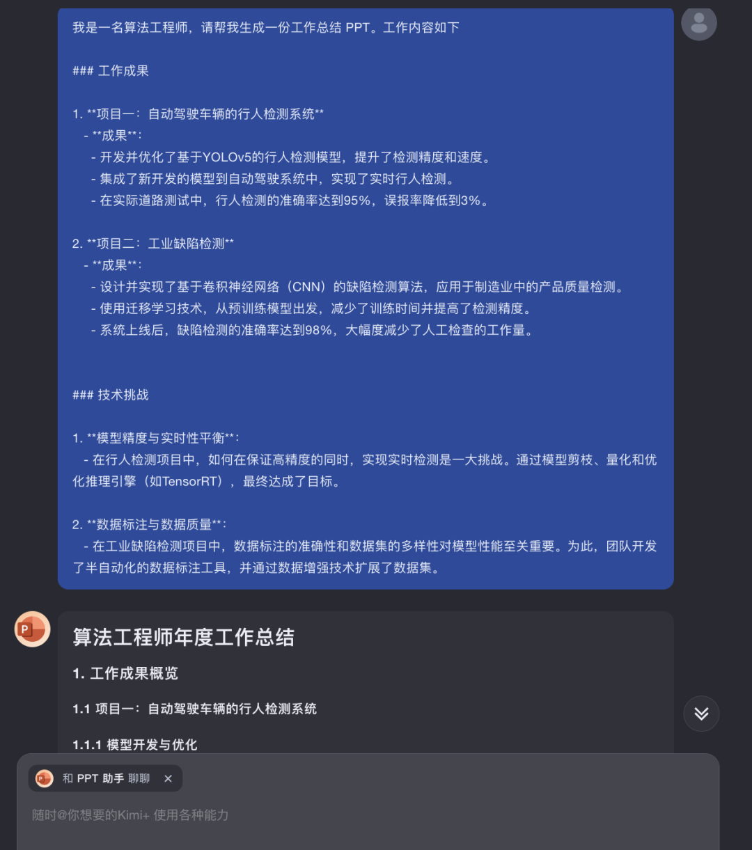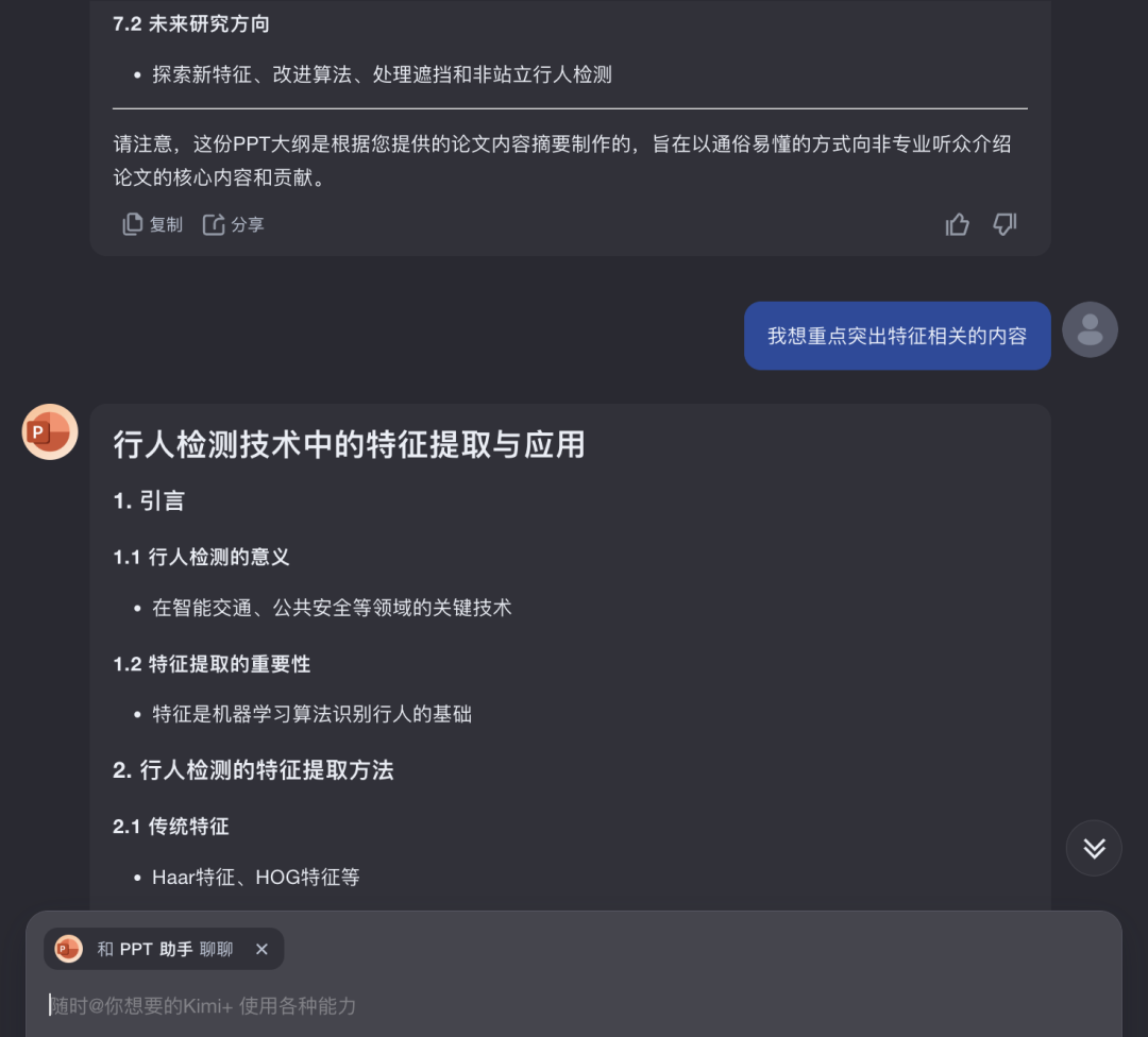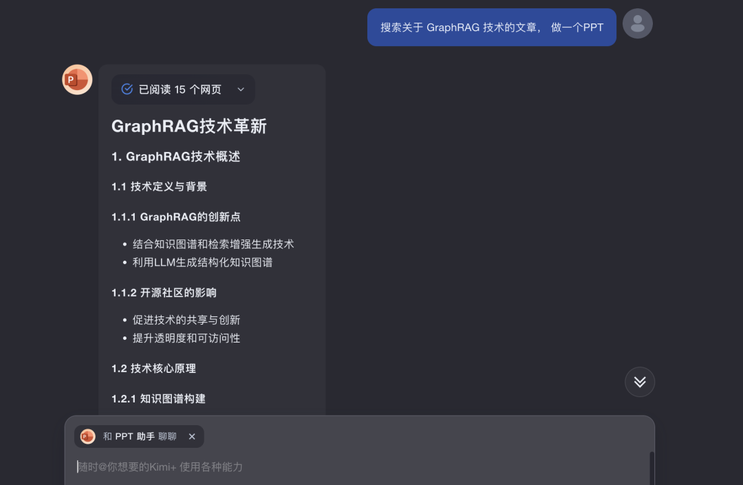 昨天 Kimi 又有大的更新,增加了PPT助手功能。 做PPT绝对是职场必备技能,记得刚进大厂的时候,做半年工作总结。 因为都是搞技术的,所以领导说 “形式不重要,简单总结就行”,咱也是听话,就严格照领导说的做。 但到汇报时候,总有一些卷王亮出了PPT,而我真用的普通的文档,简单的总结,甚至还是黑底白字,瞬间觉得自己弱爆了。 其实对于职场人,尤其是搞技术的,一年的工作都在浓缩在 PPT 里了。以前不愿做 PPT 是因为这事儿跟主业没啥关系,并且使用频率低。 但现在不一样了,有了AI大模型加持,不需要学习成本,分分钟就能做一个出来,直接跟卷王对齐颗粒度。 比如,下面这个就是我用Kimi的PPT助手生成的技术分享PPT Kimi 生成的 PPT 还是很精美的。 基于Kimi大模型的PPT助手,用起来有非常好的体验,下面给朋友们详细分享下。 点击左侧的PPT助手或者网页对话框@PPT助? 就可以使用了 最直接方式是通过提示词,一句话让 Kimi 给你生成一个PPT 我在提示词中把工作内容加了进去,这样 Kimi 就能帮我提炼重点,生成 PPT 大纲。 当然,如果内容比较多,比如,存在Word、PDF文件中,以至于没办法把原始内容放到提示词里。Kimi 也支持直接上传多个文件来生成 PPT 基于Kimi大模型的PPT助手,优势非常明显。支持最多50个文件,Kimi 的长文本总结能力,能帮你抓住重点,生成大纲。 以后领导再甩给给你一堆业界新的论文,让你总结、分享,你就直接甩给 Kimi PPT助手。 大纲生成后,会看到“一键生成PPT”的按钮 如果对生成的大纲不满意,也可以向 Kimi 追问,重新生成 可以让 Kimi 多次修改,直到你满意为止。 得到最终的大纲,点击“一键生成PPT”按钮,会跳到选择模板的页面 这里有 10W+ 模板供你选择,选好后,点击右上角“生成PPT”,就可以了。 能看到 Kimi 一步步的生成过程,非常酷炫。 生成PPT后,能直接下载,也支持编辑,做二次加工。 用PPT助手将文档转PPT既快又准。以后再搜集一堆资料做技术分享、技术调研,别再说没时间做PPT了,放着Kimi这么高效的助手不用,能怪谁。 说到搜集资料,PPT助手也支持联网搜索内容,生成PPT。 比如,最近比较火的 GraphRAG 技术,可以让PPT助手一键搜索内容、总结提炼、生成PPT。 这对于经常需要做调研的朋友来说,简直太有用了。 Kimi的PPT助手体验下来的感觉就是,功能强大、操作简单,生成速度快、生成质量高。 介绍再多,也不如大家自己亲自去试一下来的直接,推荐大家都试试。 该文章在 2024/8/1 18:38:35 编辑过 |