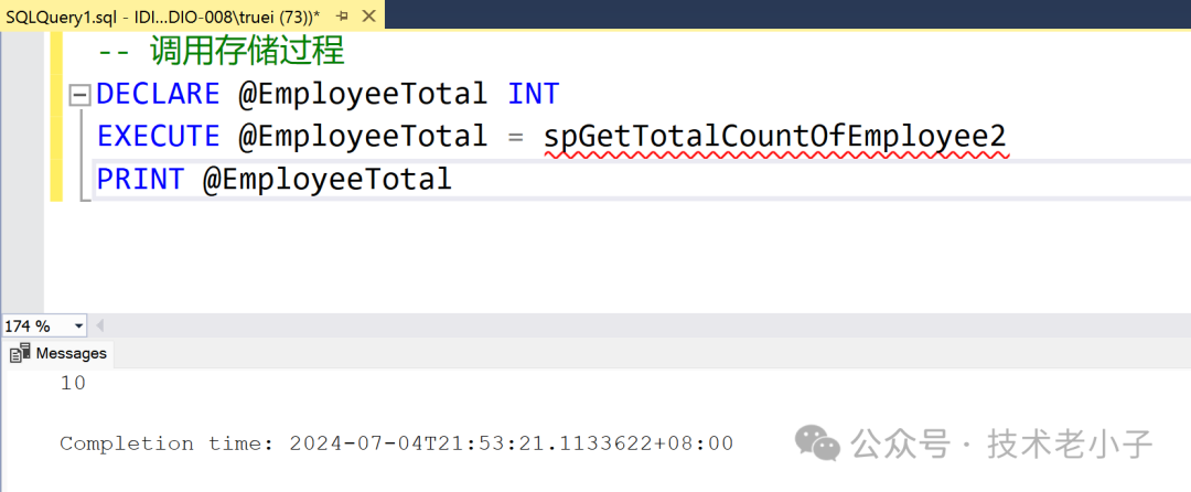 -- 调用存储过程DECLARE @EmployeeTotal INTEXECUTE @EmployeeTotal = spGetTotalCountOfEmployee2PRINT @EmployeeTotal