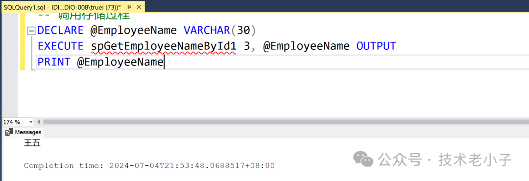 -- 调用存储过程DECLARE @EmployeeName VARCHAR(30)EXECUTE spGetEmployeeNameById1 3, @EmployeeName OUTPUTPRINT @EmployeeName