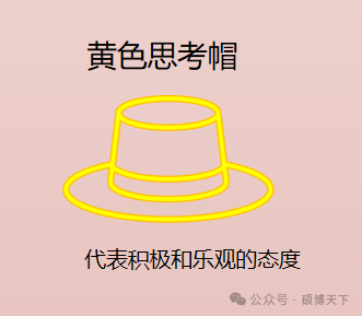 代表积极和乐观的态度。黄色思考帽鼓励人们从正面思考问题,寻找解决问题的积极方面和潜在的好处。这种思维模式有助于激发团队的创造力和积极性。