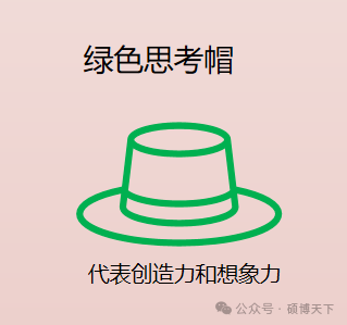 代表创造力和想象力。绿色思考帽鼓励人们提出新的想法、建议和创意。在绿色思考帽的引导下,团队成员可以充分发挥想象力,探索各种可能性。