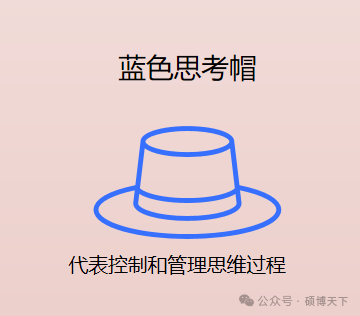 最后,使用蓝色思考帽,负责控制和调节整个思考过程,规划和管理讨论流程,并综合前面的讨论结果做出决策。蓝色思考帽的角色类似于项目经理或主持人,确保讨论能够有序进行,并最终达成一致的决策。