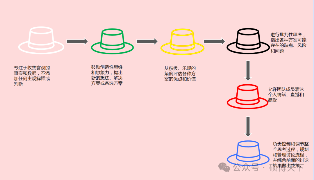 旨在通过6种不同颜色的帽子代表6种不同的思维模式,从而引导人们系统地、全面地思考问题。这种思维模式强调的是“能够成为什么”,而非“本身是什么”,旨在寻求解决方案而非争论对错。