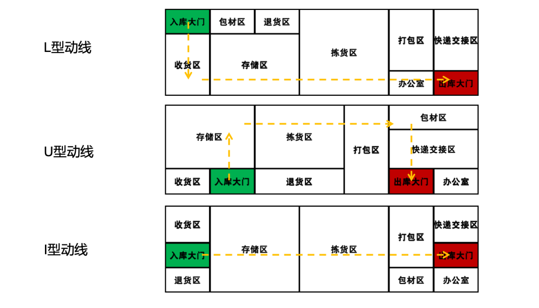仓库主动线的设计是整个仓储物流中心运行的基础,实操中常使用的仓库动线有以下三种类型: 1、L型动线 可以应对进出货高峰同时发生的情况;适合越库作业的进行;可同时处理“快流”及“慢流”的货物。 2、U型动线 出入口在仓库的同侧,根据进出货频率大小,将流量大的商品安排在靠近进出口端的存储区,缩短商品的拣货搬运路线。 3、I型动线 出入口在仓库的相对面,无论订单大小与拣货品相多少,均要通过仓库全程,适合作业流程简单、规模较小的作业。