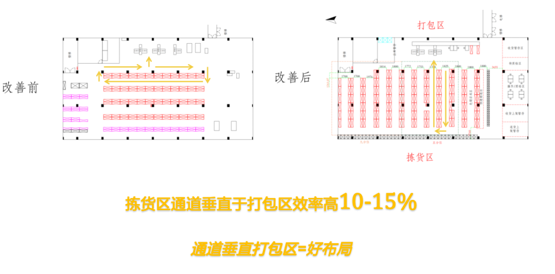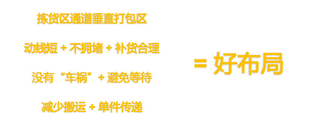 仓库通道设计跟库位设计有同样的原理,切忌为了美观将所有通道大小设置的整齐划一,这种通道是中看不中用的。仓库通道在设置过程中需要考虑以下4个因素: 常见的通道类型及参考数据如下表所示: 这里需要特别提醒仓库管理者在设计通道的时候,尤其要注意拣货通道的设计朝向,经过数据测算,拣货通道垂直于打包区为最佳通道朝向。 综上所述,好的仓库布局可以总结为以下4句话: 该文章在 2024/8/2 18:11:13 编辑过 |