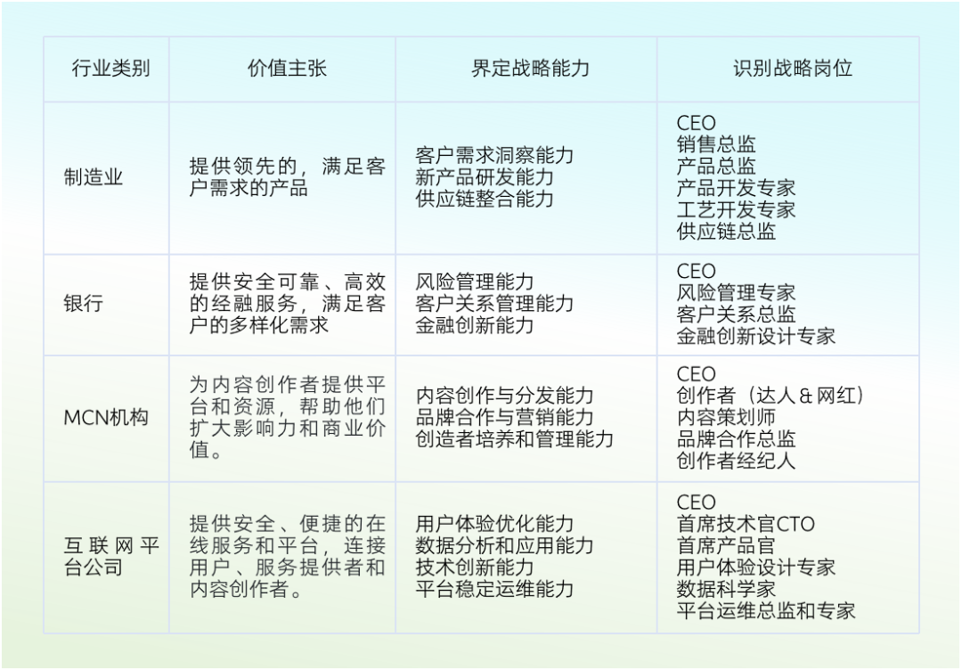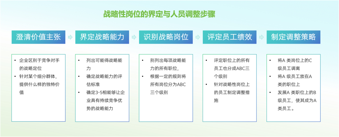 编者荐语: 短期看,裁员能够降低人工成本,但是长期看,裁员并不是一个最优选择。裁员不仅会让企业形象受损,如果一不小心裁到大动脉,会还给企业带来灾难性后果。 一说到降本增效,很多企业立马会想到裁员降薪。短期看,裁员能够降低人工成本,但是长期看,裁员并不是一个最优选择。 裁员不仅会让企业形象受损,如果一不小心裁到大动脉,会还给企业带来灾难性后果。 所以,与其降低投入,不如提升产出。人力资源降本增效的关键不在于通过裁员降薪降低绝对人工成本,而是要提高人效,提高单位人员的产出贡献。 对于企业来讲,真正有效的策略,不在于在每个人身上花了多少钱,而在于每花一块钱能赚多少钱。如果对人力资源的投资,每一块钱都能换来两块钱,那么只要企业的财务实力允许,再多的投资也不为过。 企业最大的内耗是人才错配。提高人力资源的投入产出效率,关键是要把合适的人放在合适的岗位上,让他们充满激情和热情的投入并高效的完成工作。 更为重要的是火车跑得快,要靠车头带。企业要提高人效,必须先要求干部,而不是先折腾员工。这些道理看起来很简单,基本上都是常识,但是却少有企业做得到。 01 把合适的人放在合适的岗位上 企业的错配有两种表现:一个层面是员工的技能、经验和能力与岗位需求不匹配。这问题的本质就是没有用人所长,特别是有的领导喜欢控制一切,希望员工按照自己的方式行事,全然不考虑员工的优势和特长,只按照自己的偏好行事,甚至是用人所短。 更高层面的人才错配是员工的配置与企业的战略定位和战略意图不匹配。没有把战略性人才没有放到战略性岗位上,发挥战略驱动作用和战略影响力。 这些关键的战略性人才通常具备独特的视野和能力,若被置于非战略性岗位,甚至弃之不用,就导致这些宝贵的资源不能得到有效利用,造成巨大的浪费。这是组织人效低下的核心原因。 人才策略只有聚焦如何驱动战略执行才能真正的创造价值,所以人才配置的核心就是提升战略人才与战略关键活动的契合度。 根据二八原则,20%的人才将创造80%的价值(管理大师拉姆查兰的观点更为极端,他认为无论组织多大,会对组织绩效产生巨大的影响关键人物只有2%) 。 所以最有效率的人才投资策略就是对那些具有战略性价值的A类员工,进行倾斜性投资。把A类人才放在A类战略性岗位上服务A类客户,创造A类的价值。 那么,什么是战略性A类岗位?什么是战略性A类人才?这并不是显而易见的事情! 全球著名的人才管理专家,约翰.布德罗曾经分享过一个案例: 在“全球最快乐的地方”迪士尼乐园的管理层眼中,以下谁是关键人才? a.经典动画形象米老鼠的扮演者 b.清洁工 c.游乐园设计师 d.剧场演员 教授给出的正确答案是b.清洁工。 为什么这么一个听起来毫不起眼的岗位,居然是战略性的岗位? 因为迪士尼的战略目标是,让顾客在游园旅程中,实现顾客愉悦时间的最大化;乐园的价值主张是全世界最快乐的地方,而清洁工是乐园服务大使,活地图,需要多样的技能,有着陡峭的绩效收益曲线,对创造第一无二的快乐体验的战略目标有直接的影响力。 所有的岗位都有价值,但不是所有的岗位都有战略性价值。哪些岗位是战略性岗位是一个需要认真思考的事情,不是一定级别以上的岗位就是战略性岗位;即使是级别很高的岗位如果在战略执行上无足轻重,那也不是战略性岗位;那怕是最低层次的岗位如果是关键战略的执行者,那么也是战略性岗位。 职位和岗位是人才策略和经营战略的交叉点,在这一交叉点上,人才被转化为战略影响力。所以,卓越的管理者都非常重视职位和岗位体系的建设。而这个体系建设最重要的部分就是界定哪些战略性关键岗位,只有界定清楚了,再去探讨人才的问题才有意义。 一方面,要提高战略岗位和战略人才的匹配度 那么什么是战略性岗位?那我们就要问是哪些岗位代表了企业的核心能力,形成了企业的竞争优势?那么自然我们先要回答,企业的价值主张是什么,核心战略能力是是什么,能够驱动战略执行构建竞争优势的关键业务流程有哪些?这些流程上哪些岗位发挥了战略性的作用。 所以,通过提高人岗匹配度,提高核心人才对战略的驱动作用来提升人效,那么花时间去思考对于企业成功来讲,最重要的战略能力是是什么,战略性的职位有哪些。 首先要澄清企业的战略定位和价值主张,界定战略能力,然后识别出战略岗位,对员工进行评定,并对战略性岗位的员工制定调整计划。 主要的调整策略是,撤销C 类职位,将A 类岗位上的C 级员工调离,将A 级员工放在A 类的职位上,发展A 类职位上的B 级员工,使其成为A 类员工。 一些行业战略岗位分析和识别案例: 以上案例只是一个分析框架,不同行业的具体企业还要根据实际情况进行分析: 比如同样是超市,沃尔玛和好事多价值主张不同,战略能力不同那么战略岗位也不相同,好事多是移动高性价比的精选商品,提供会员服务,因此供应链管理、会员忠诚度和品牌合作能力是其核心能力;而沃尔玛提供的是每日低价,一站式购物,通过技术提高运营效率,因此大规模全球采购和电子商务和物流系统创新是其核心能力。 比如对于互联网平台公司,不同的平台有不同的业务平台,有电子商务平台、社交媒体平台、内容分享平台,搜索引擎平台等多种类型。所以,即使是电子商务平台,拼多