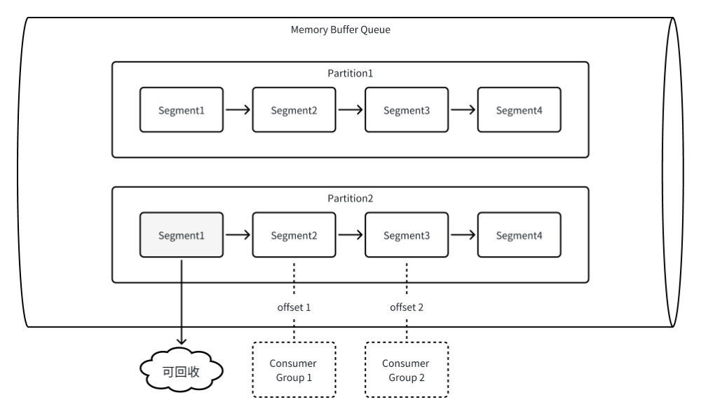 每次在 Partition 中新增 Segment 时,会从头判断此前的 Segment 是否已经被所有消费组消费完,回收最后一个消费完的 Segment 作为新的 Segment 追加到 Partition 末尾使用。