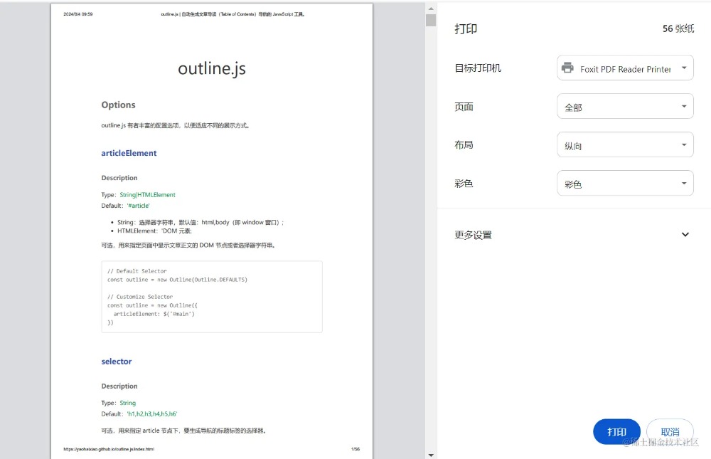这个是打印预览界面: 前文介绍的主要的打印页面的技巧在 outline.js 中基本都用到了。以下是完整的打印样式代码: @media print { html, body { /* 打印的基础字体大小 */ font-size: 12pt; /* 显示设置文字颜色和背景颜色 */ background-color: @white; color: @primary_text_color; height: initial !important; } /* 设置链接样式 */ a:link, a:visited, a:hover { text-decoration: underline !important; color: @primary_color; } /* 隐藏媒体标签 */ video, audio { display: none !important; } /* 确保表格在打印时的边框和对齐方式清晰 */ table { width: 100%; border-collapse: collapse; } th, td { border: 1px solid @primary_border_color; padding: 8px 20px; } .outline { &-message, &-toolbar { /* 隐藏了工具栏和信息提示框 */ display: none !important; } &-reader { display: block !important; overflow: hidden; &__title { margin: 13.4pt 0 28pt !important; text-align: center !important; font-size: 32pt !important; } /* 取消了绝对定位 */ &--reading { position: relative !important; height: auto !important; padding: 0 !important; background-color: @white; overflow: hidden !important; } /* 隐藏阅读进度条 */ &__progress { display: none !important; } /* 打印时不显示正文 DOM 的阴影效果 */ &__paper { box-shadow: none; } pre { padding: 1em !important; border: 1px solid @border_color !important; border-radius: 4px !important; } pre, code { background-color: @white !important; } table, img, svg { break-inside: avoid; } /* 所有文章内容 DOM 相关的邻居节点都隐藏了 */ &_sibling { display: none !important; } } } } 设置打印样式的基础字体大小和文字和背景颜色: @media print { html, body { /* 打印的基础字体大小 */ font-size: 12pt; /* 显示设置文字颜色和背景颜色 */ background-color: @white; color: @primary_text_color; height: initial !important; } } 设置链接文字高亮显示 @media print { /* 设置链接样式 */ a:link, a:visited, a:hover { text-decoration: underline !important; color: @primary_color; } } 隐藏媒体标签(内容) @media print { /* 隐藏媒体标签 */ video, audio { display: none !important; } } 确保表格在打印时的边框和对齐方式清晰 @media print { /* 确保表格在打印时的边框和对齐方式清晰 */ table { width: 100%; border-collapse: collapse; } th, td { border: 1px solid @primary_border_color; padding: 8px 20px; } } 隐藏了非正文 DOM 的所有其他内容 @media print { .outline { &-message, &-toolbar { /* 隐藏了工具栏和信息提示框 */ display: none !important; }
