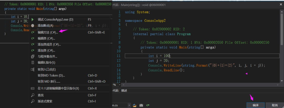 为了更好的理解通过 dnspy 修改,先来聊一聊 dnspy 最便捷的修改 dll 的方式:编辑方法,这种方式非常方便,无需理解 IL 代码,为了演示,我举一个简单的加法运算。
