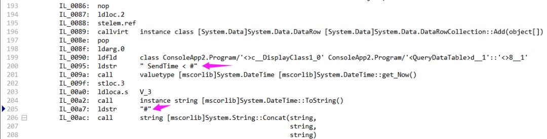 • 异步方法会生成状态机,用 C# 模式看反编译的代码,那些自动生成的状态机类看都看不到,谈何修改???比如你能找到:var where = $" SendTime < #{DateTime.Now.ToString()}#"; 吗?