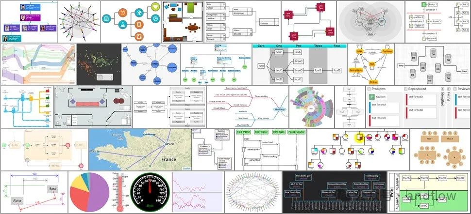 GoJS是一个可用于创建许多不同类型的交互式图表,非常灵活,支持数据可视化、绘图工具和图形编辑器等功能。支持的图形包括:流程图、组织结构图、业务流程BPMN、泳道、时间线、状态图、看板、网络、思维导图、sankey、家谱和基因图、鱼骨图、平面图、UML、决策树、PERT图表、甘特等数百个。GoJS包括许多内置的布局,包括:树布局、热力图、圆形和分层有向图布局,也支持自定义布局。