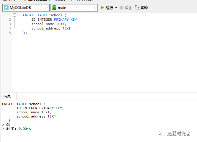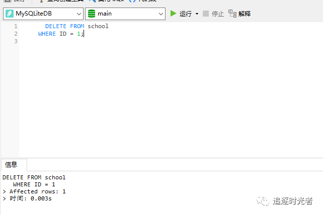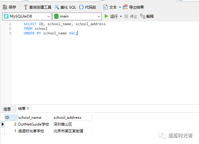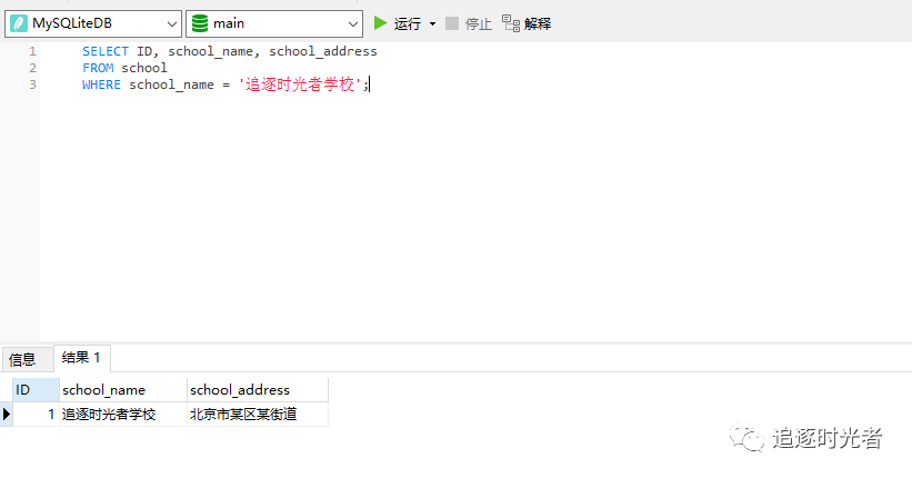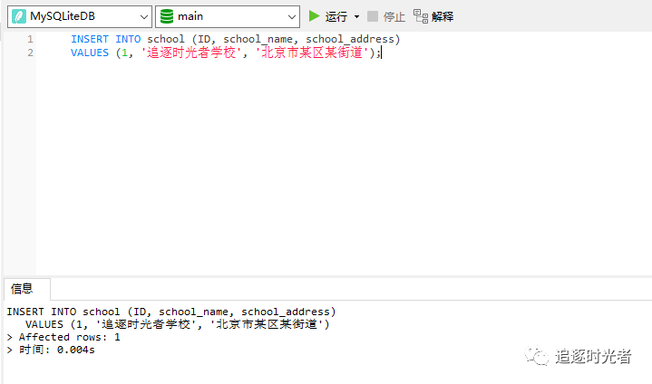VALUES (1, '追逐时光者学校', '北京市某区某街道');