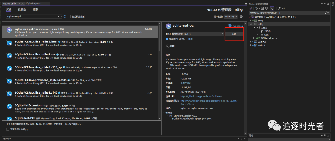 安装 sqlite-net-pcl Nuget包