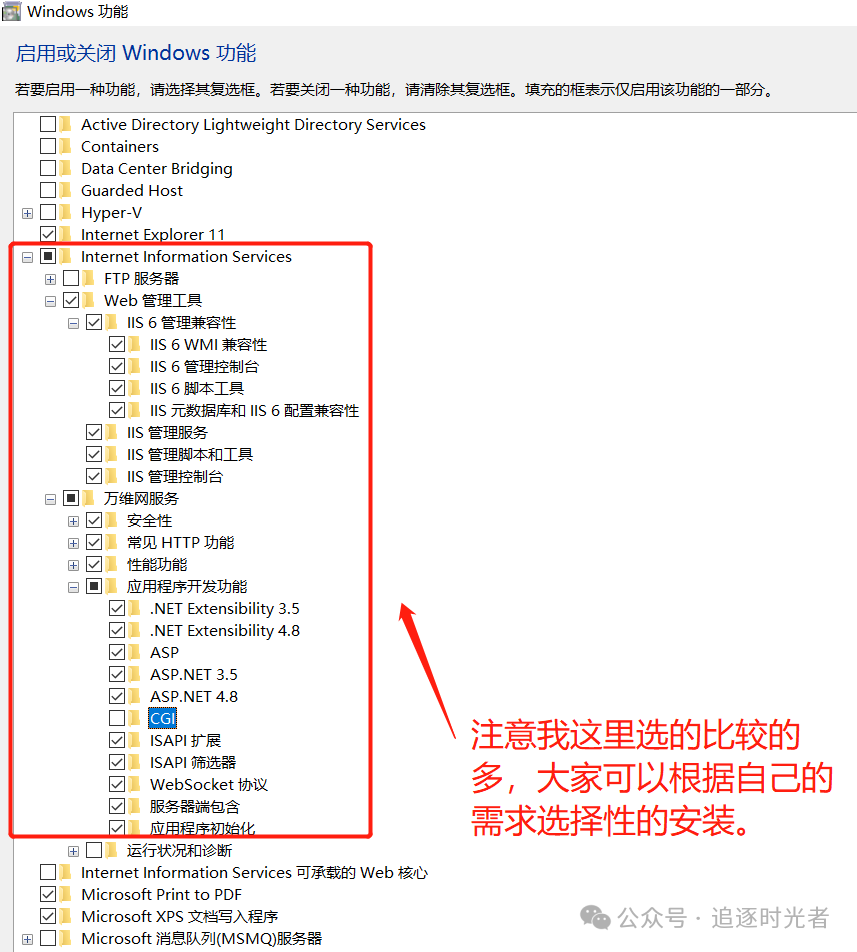 注意:无需选中"设置"下的所有Internet Information Services, 按照自己的需要选择安装即可。