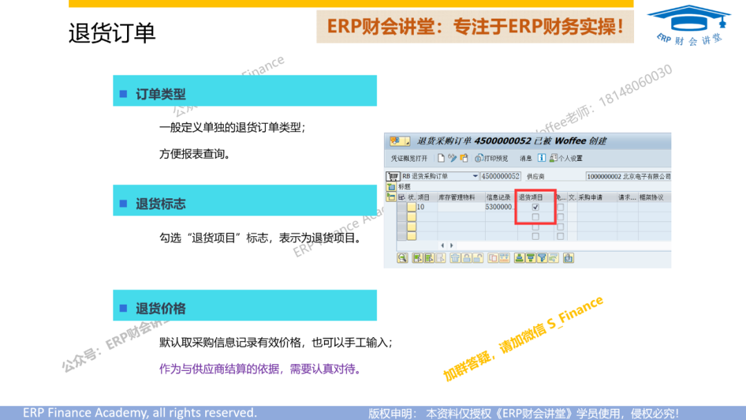 特别提醒:采购退货订单,一定要选中“退货项目”,可以不单独定义采购订单类型,但是“退货项目”必须勾选。