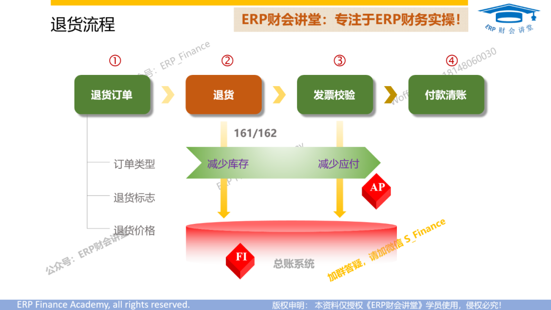 最后,给大家总结一下:采购退货,同正常的采购一样,需要创建采购订单,MIGO收货,MIRO发票校验,系统生成记账凭证时,并不会红字记账,会虚增会计科目的借贷发生额。