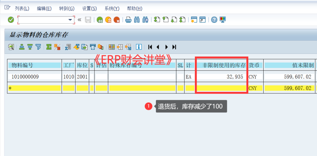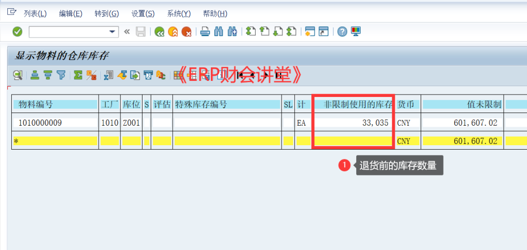 第二步,退货给供应商,减少库存。实际上也是在系统中MIGO对采购订单做收货,此时减少库存。MIGO收货前,MB52查看库存如下: